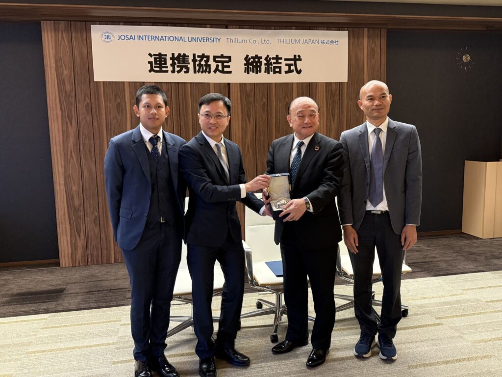 the signing ceremony (from left) Thilium Co., Ltd. CEO Clark, University President Kurabayashi, and THILIUM